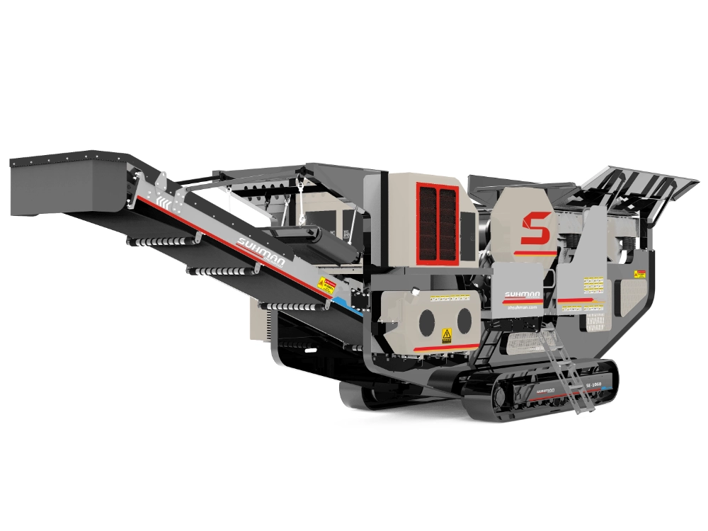 Suhman SE-1060 mobile jaw crusher by Suhman is designed with a robust jaw crushing system mounted on a tracked chassis. It operates based on a mechanical compression principle: material enters the crushing chamber, where a fixed jaw and a moving jaw form a V-shaped cavity. The moving jaw periodically presses against the fixed jaw, crushing the material through repeated compression and shearing. This motion is powered by a heavy-duty eccentric shaft, ensuring consistent performance and reliable throughput even under tough conditions.